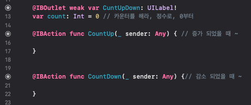 @IBAction func CountDown(_ sender: Any) {// 감소 되었을 때 ~