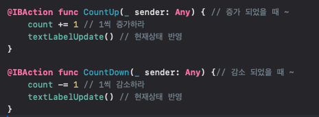 @IBAction func CountUp(_ sender: Any) { // 증가 되었을 때 ~