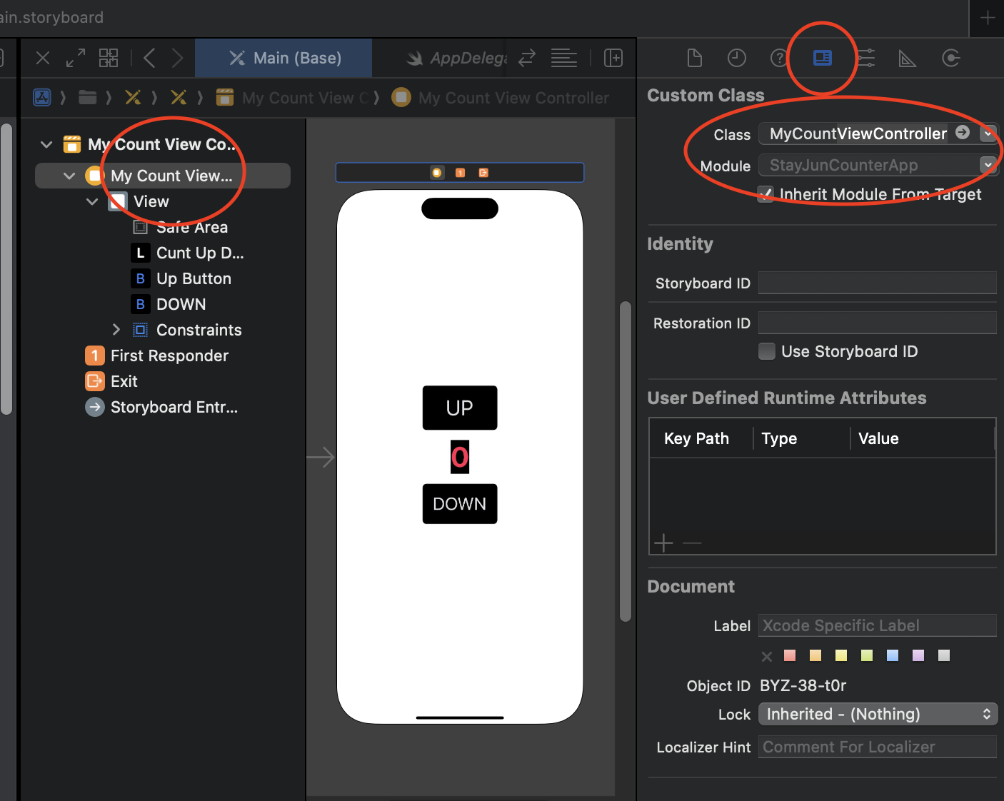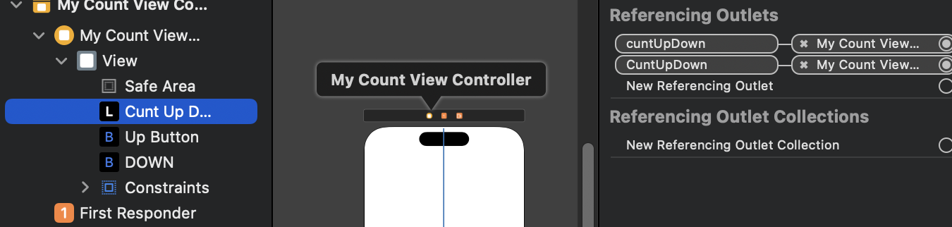 아마도 Interface Builder에서 "CuntUpDown"라는 아울렛을 만들었지만,