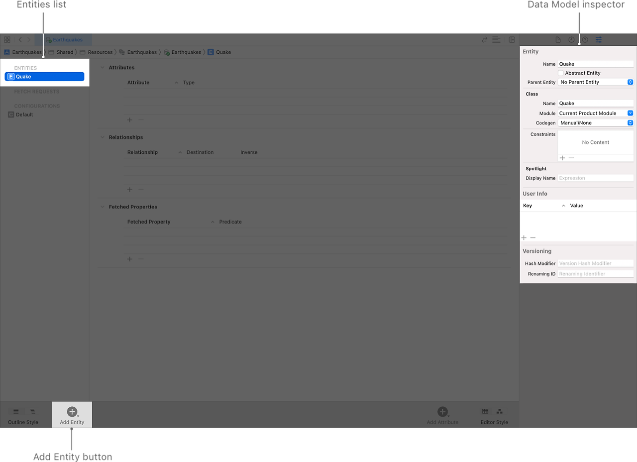 'Data Model Inspector'를 열어, 'Entity'를 구성가능