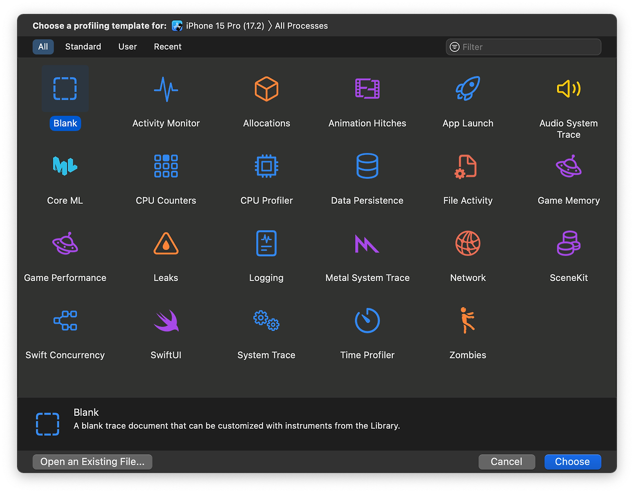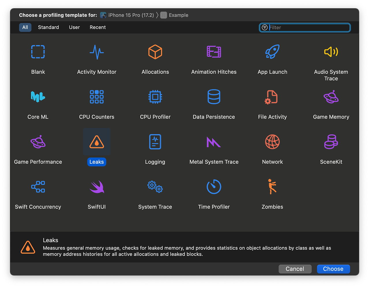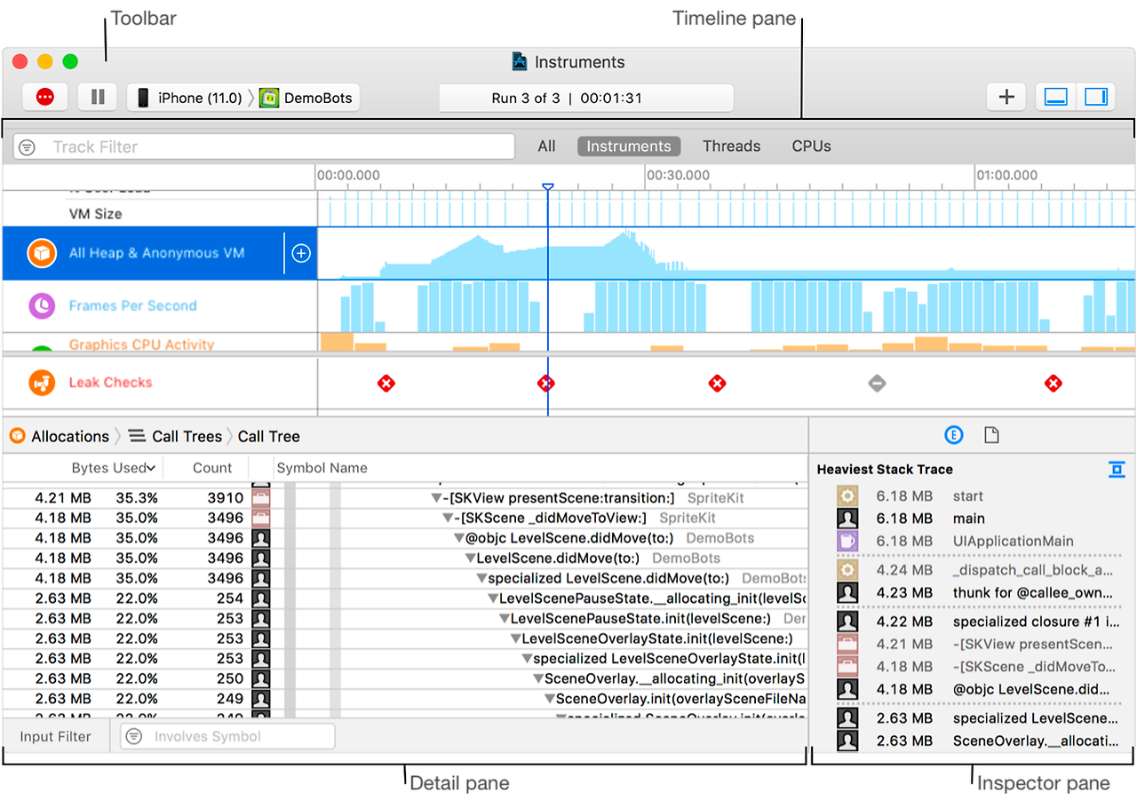 Xcode Instruments는 Xcode 내에 포함된 성능분석 및 디버깅 도구
