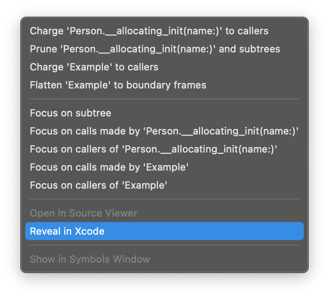 Reveal in Xcode를 눌러 누수가 발생한 파일을 Xcode에서 확인 가능
