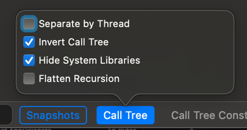 하단의 CallTree를 클릭해서 invert Call Tree (트리 반전),