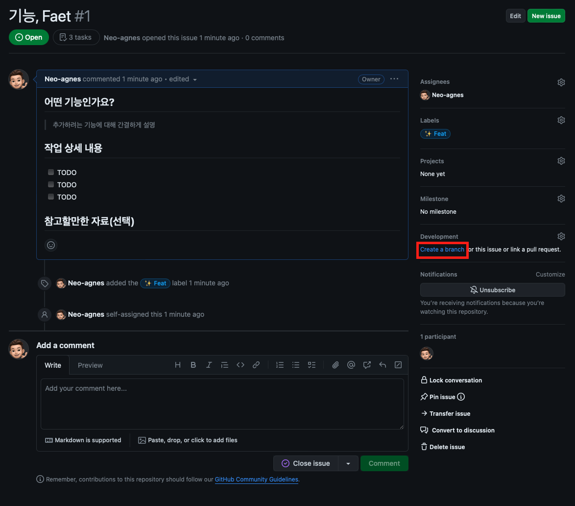 자동으로 브랜치와 이슈가 생성되어 있습니다.