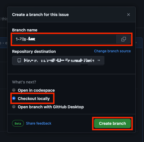 위 이미지와 같이 설정 후 Create branch를 누르면 새로운 브랜치가 만들어지고,