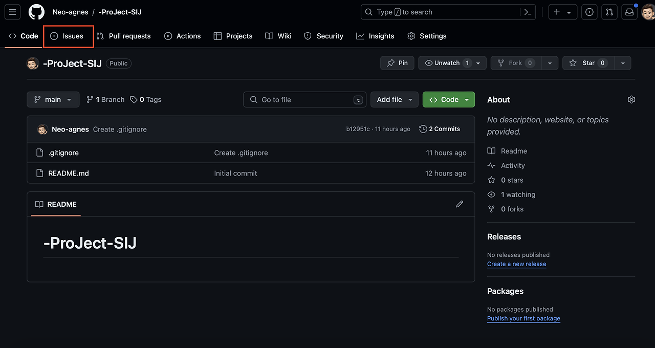 안에 들어가게 되면 내가 만든 이슈로 생성이 되어 있을 겁니다.