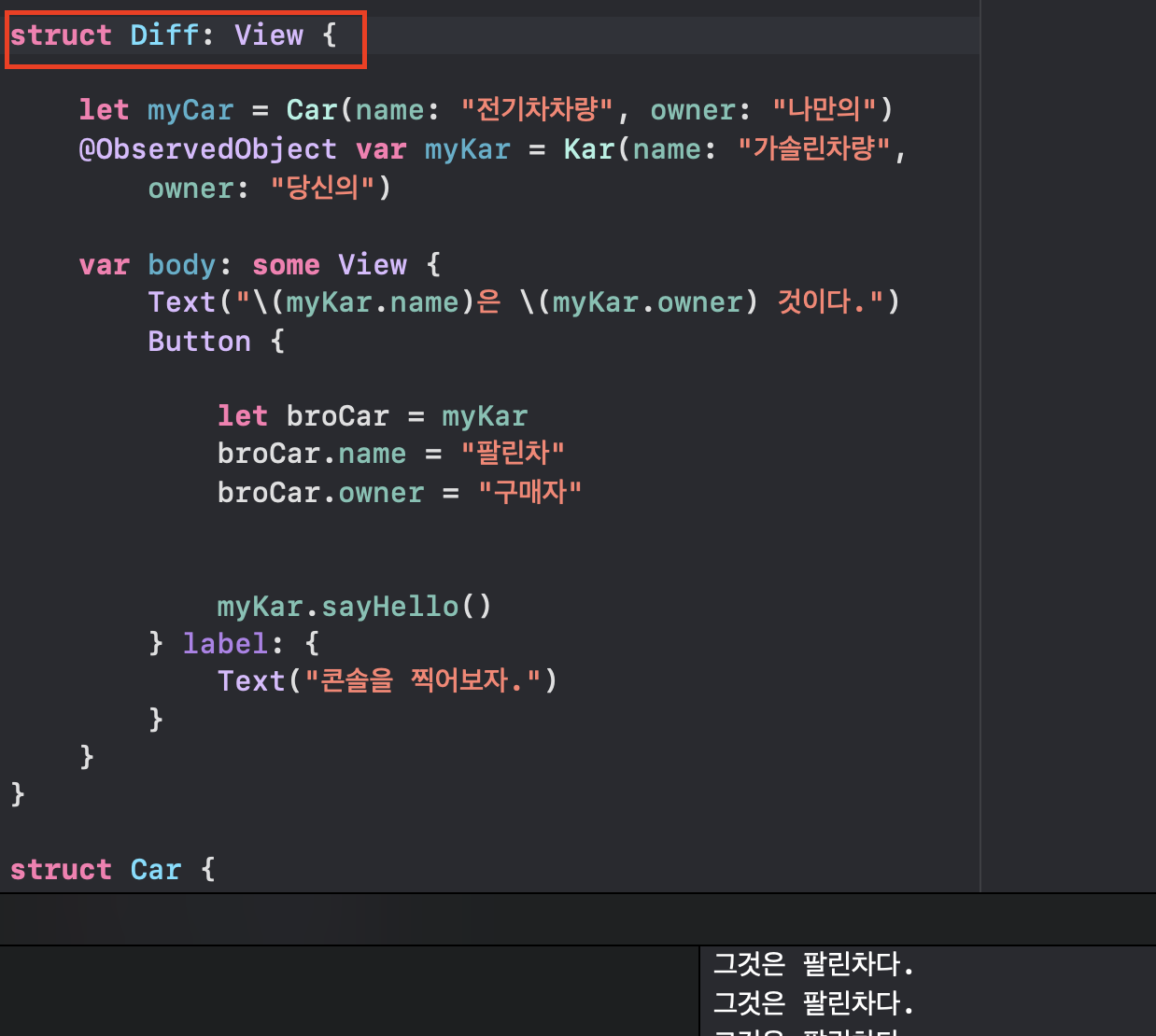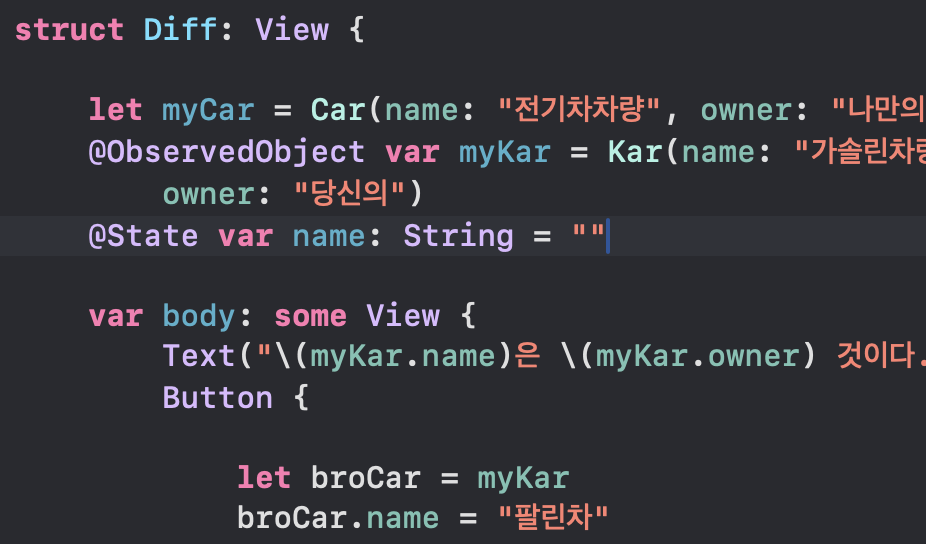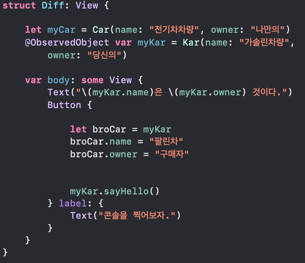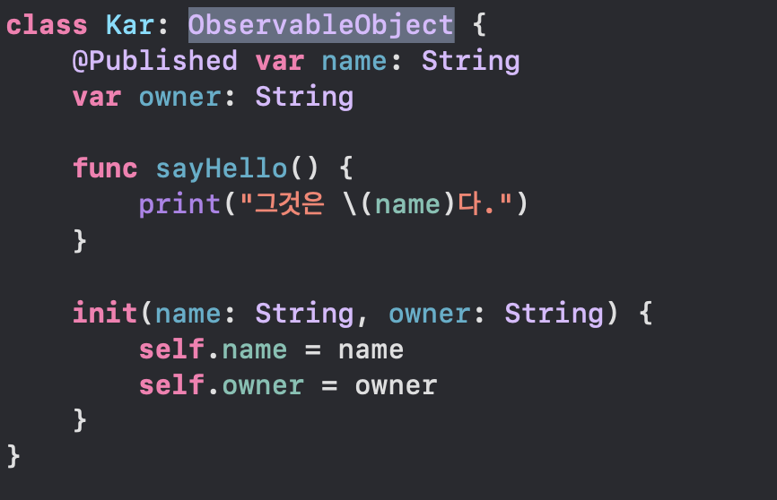 "@ObservedObject var myKar = Kar(name: "가솔린차량", owner: "당신의")"