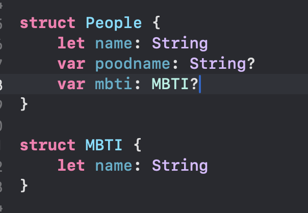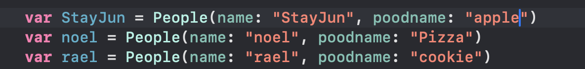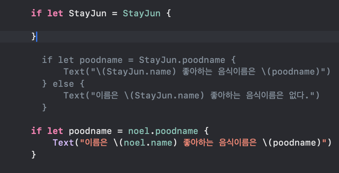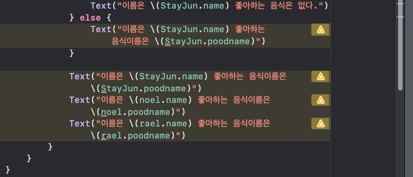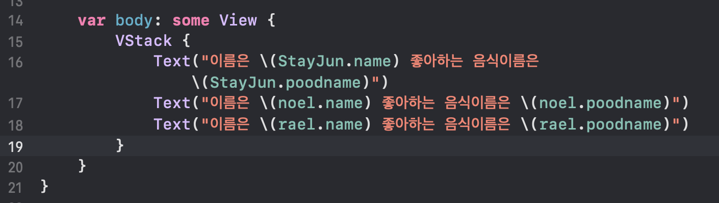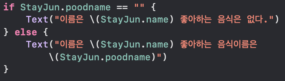 Text("이름은 \(StayJun.name) 좋아하는 음식이름은 없다.")