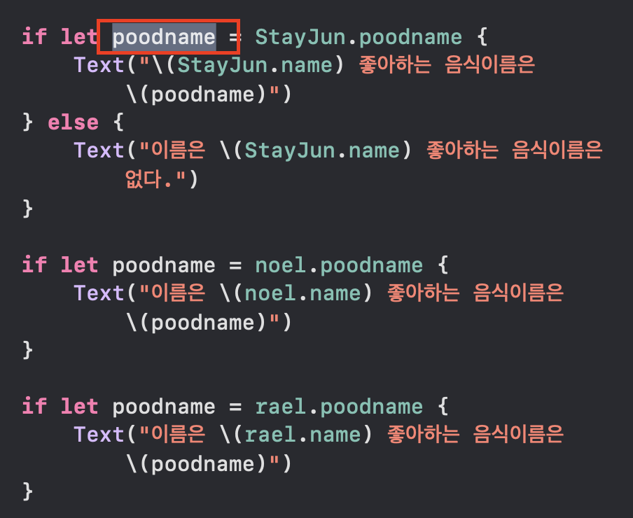 "Text("\(StayJun.name) 좋아하는 음식이름은 \(poodname)")" 이 부분에서
