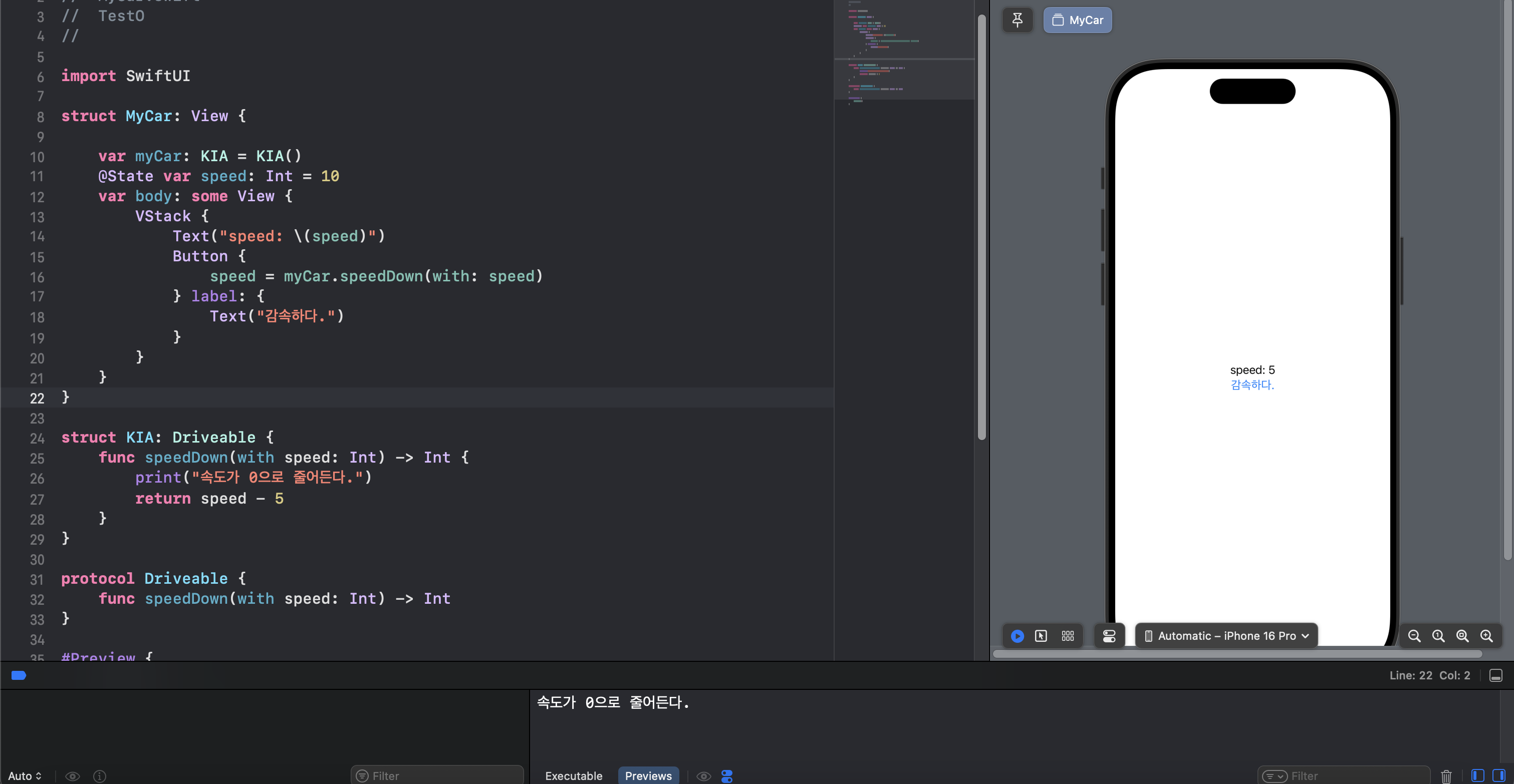 "엥? 어떻게 myCar에 speedDown이 있는거지..?"