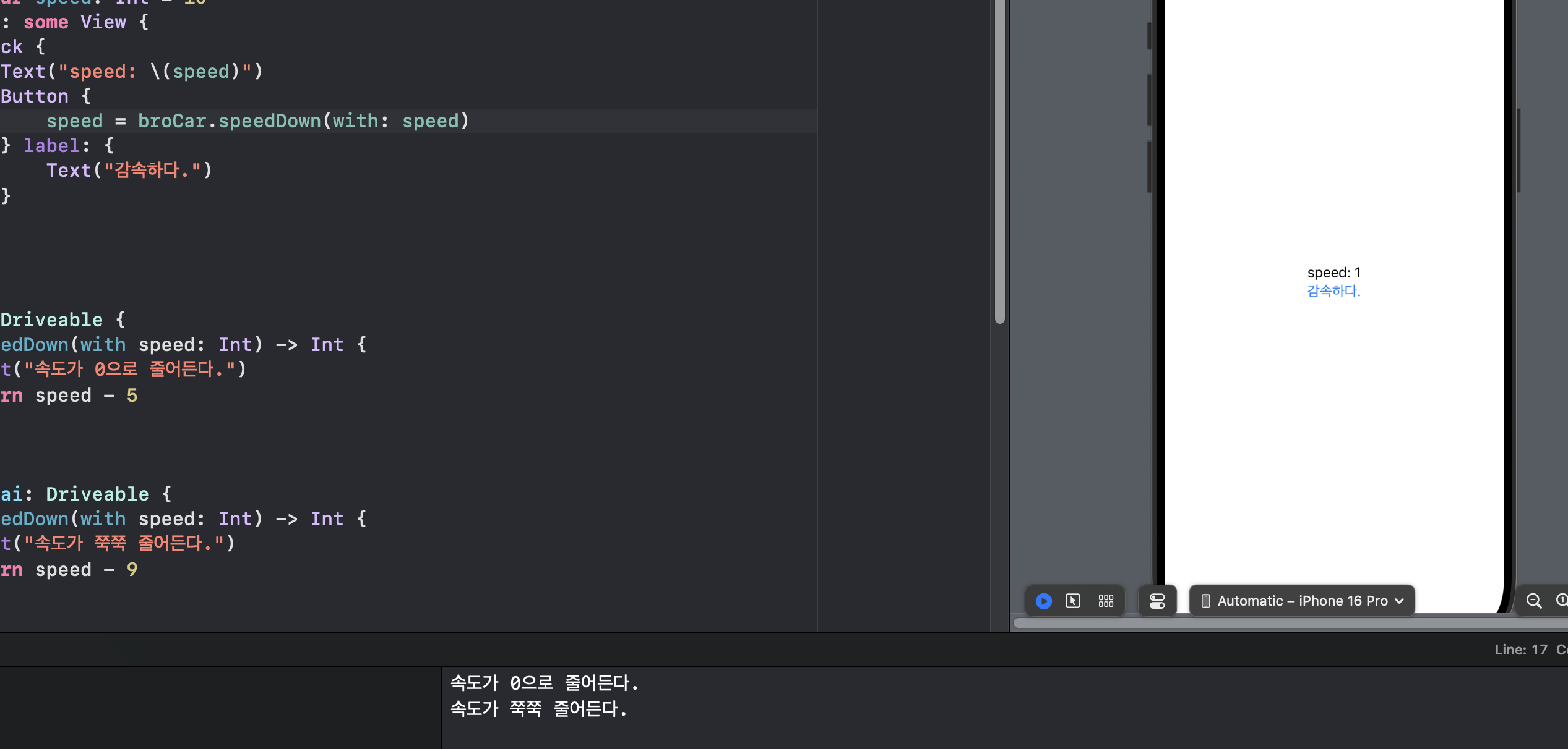 "func speedDown()" 해서 With: Int 음..