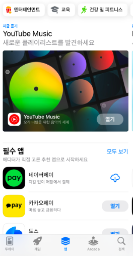 화면의 아랫쪽에 투데이, 게임, 앱