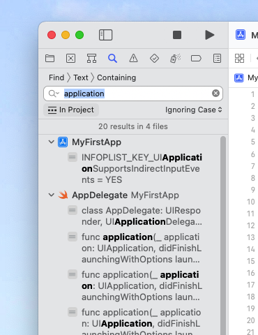 자동으로 구성된 테스트용 파일인 MyFirstAppTests.swift의 내용을 보여주는 영역입니다.