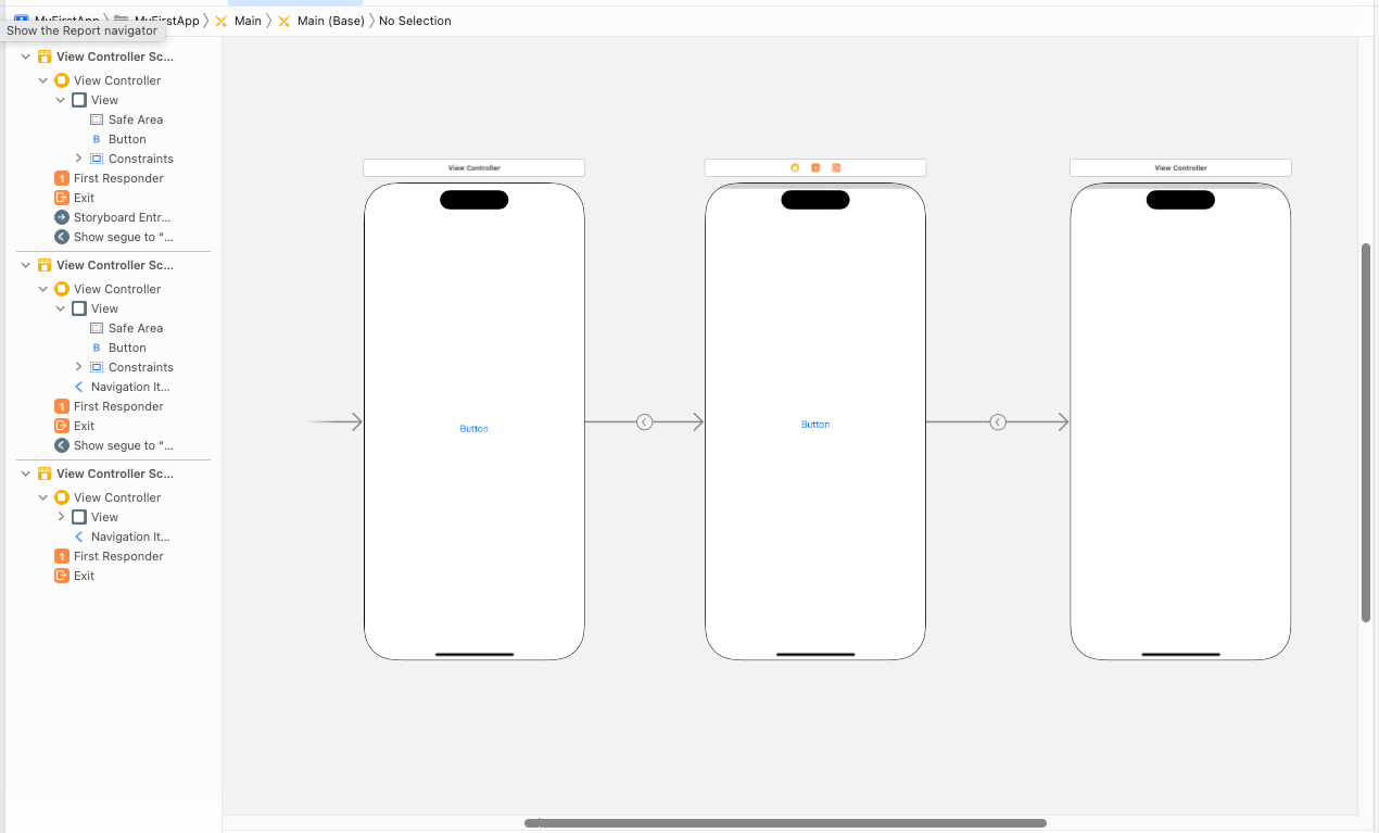 클래스 파일 등의 텍스트 기반 파일을 편집할 때와는 달리 스토리보드 파일이나 nib, xib 파일을 편집할 때에는 인터페이스 빌더가 실행됩니다. 인터페이스 빌더는 화면 UI를 설계할 때 사용되는 에디터로, 그래픽 기반의 툴입니다.