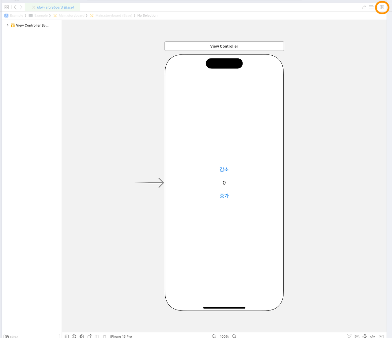 노출되는 목록에서 좌측은 스토리보드상의 객체를 우측은 코드상의 객체를 나타냄