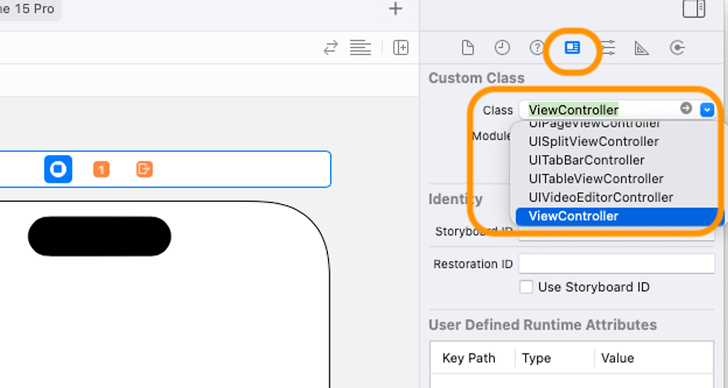 "ViewController"와 연결할 스토리보드를 클릭 -> 우측 "Identity Inspector"에서 "Custom Class"영역의 "Class" 부분을 확인