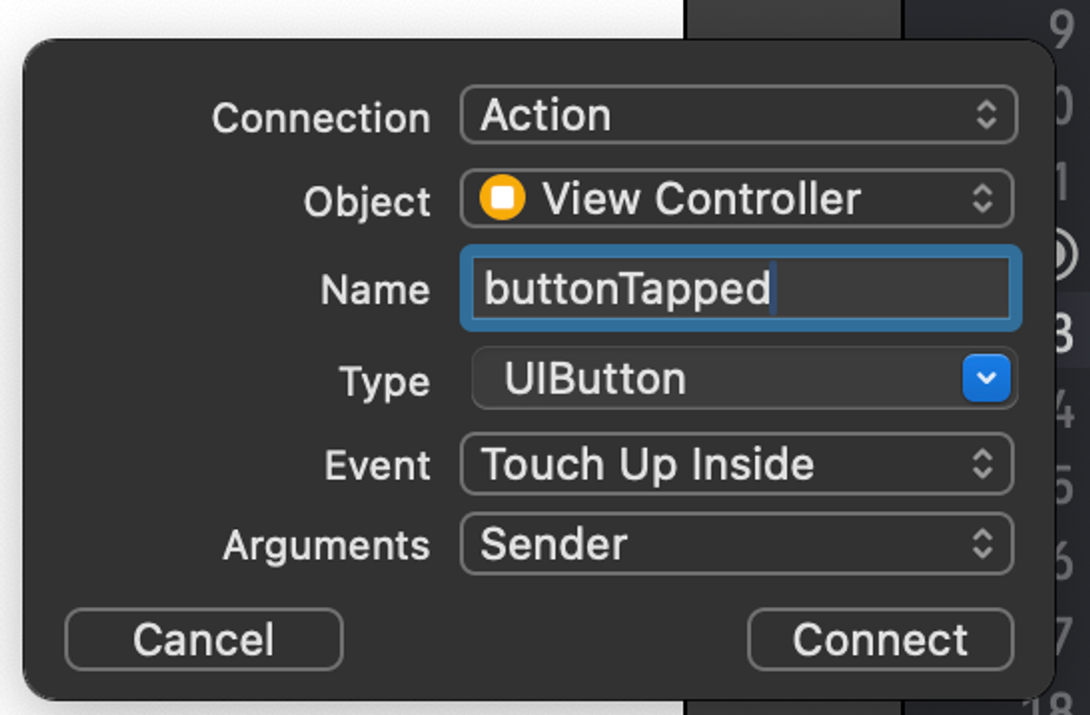 "Type"을 "UIButton"으로 설정 -> "Connect" 클릭